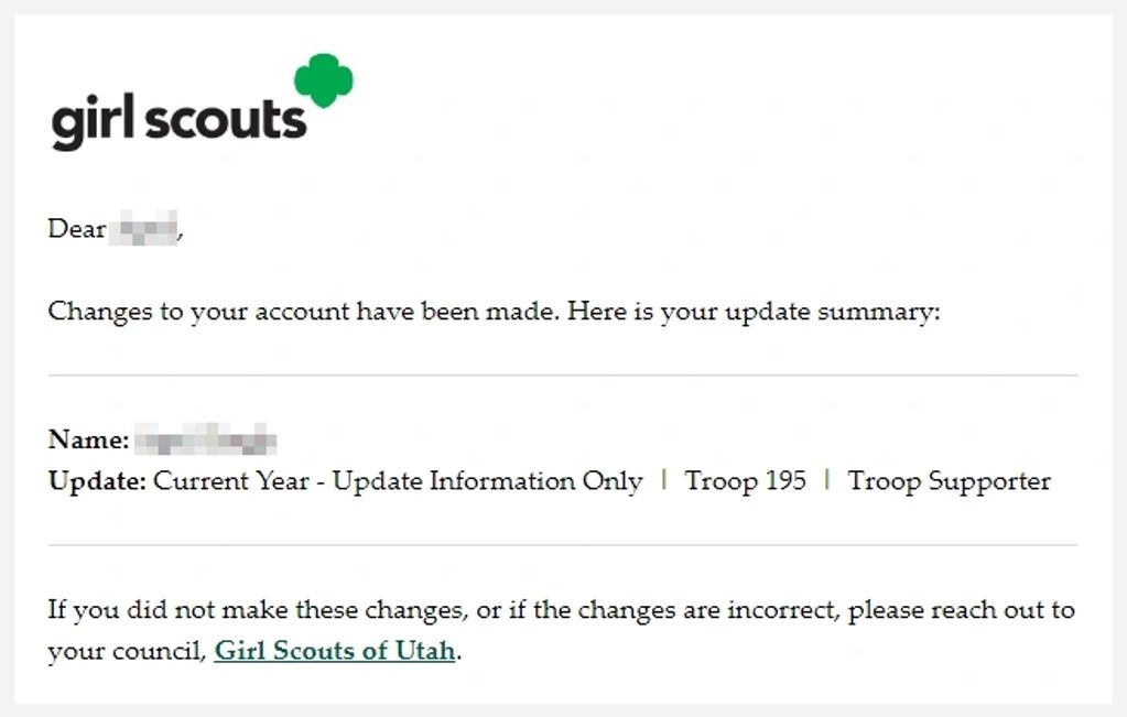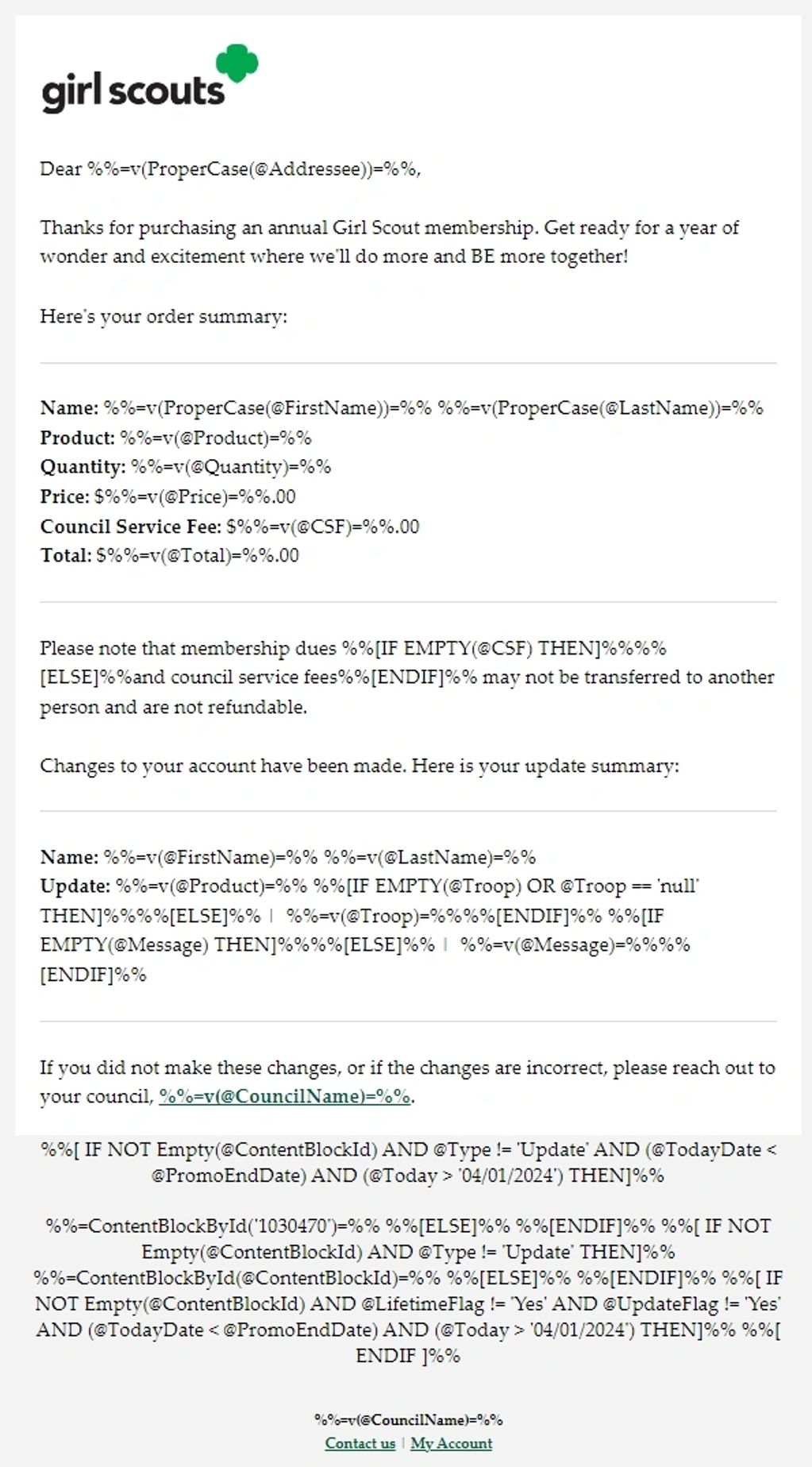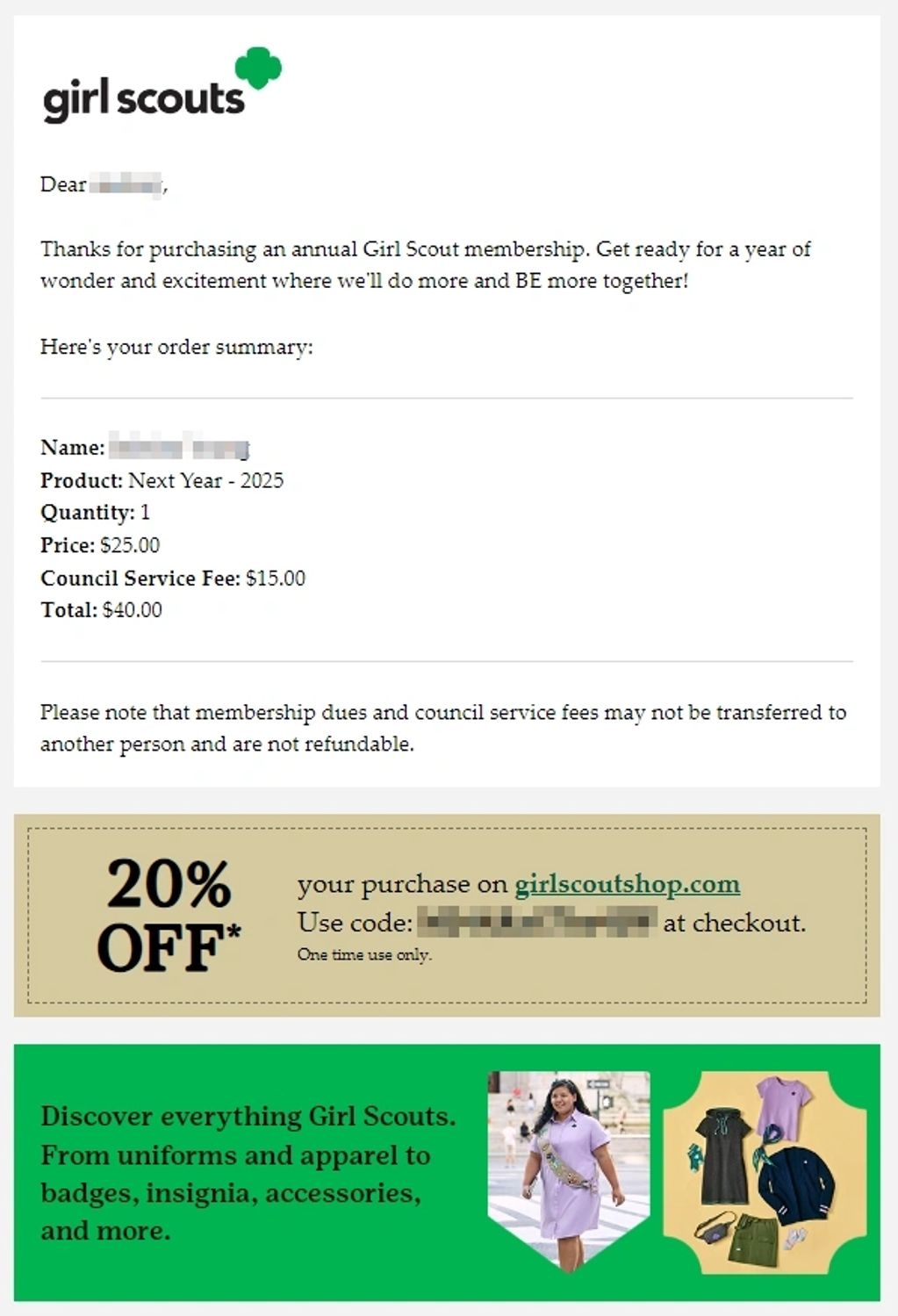 This is the email after it is triggered. A coupon and 'related' product section appears at the bottom. Coupon will disappear after the promotional date. The related product content is dynamic based off of what Girl Scout grade level they will be renewing for. This view is for girls renewing as Cadettes, Seniors or Ambassadors.