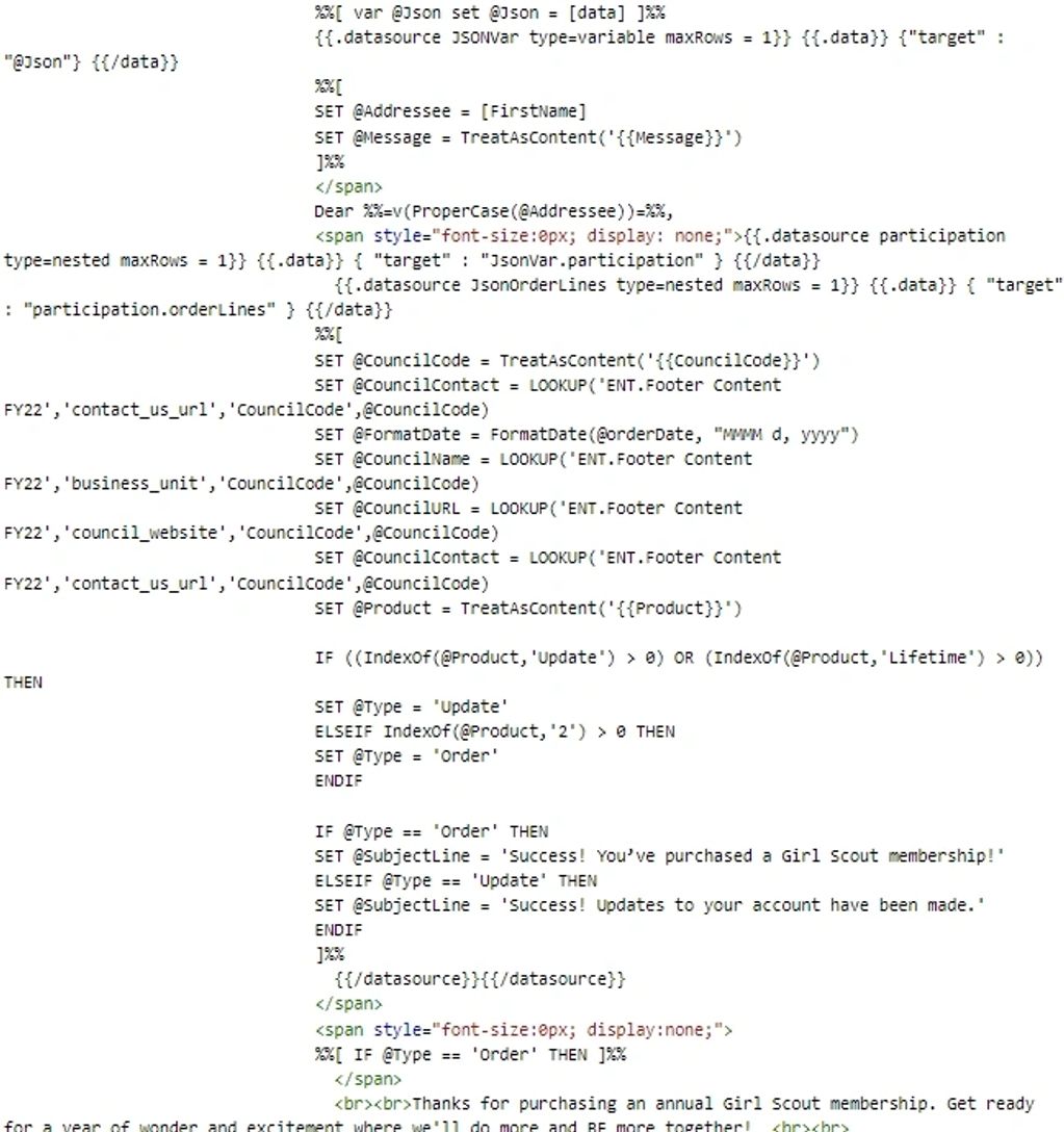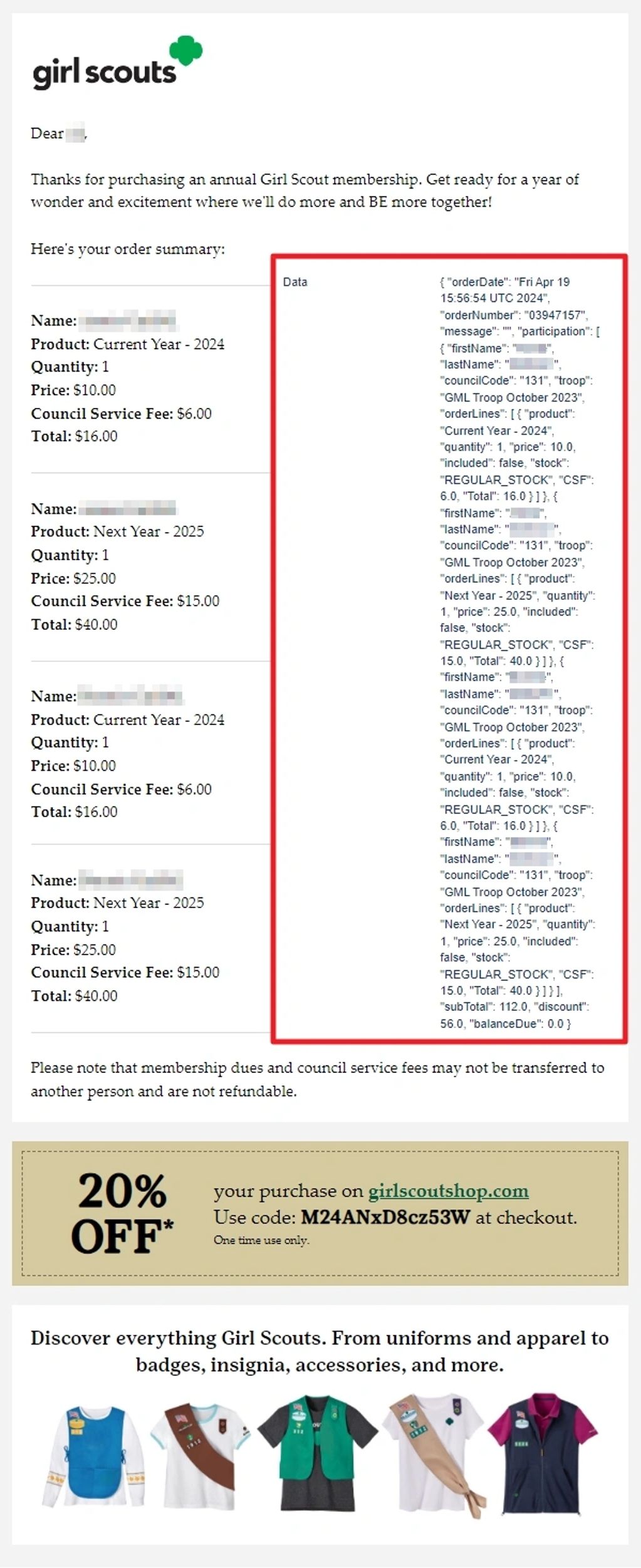 This is another example of multiple persons and/or order lines in one transaction. There is also a screenshot of the JSON data that is used to render the email. At the bottom of the email you see the coupon and related product content is different. Since this is a brand-new member and their member data doesn't load until the next day, I've provided a more generic product content block.